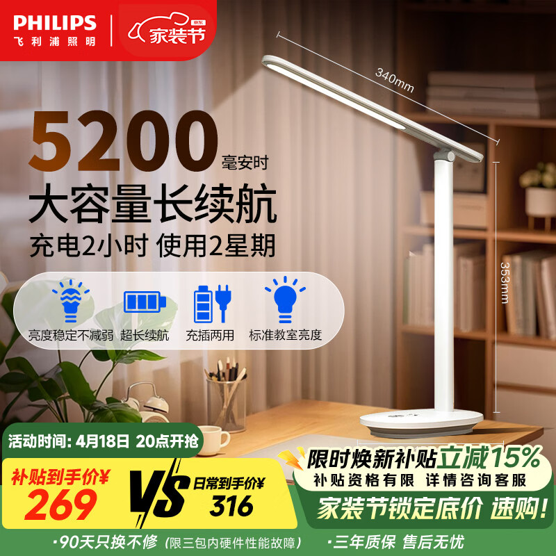 飞利浦(PHILIPS)充电护眼台灯学习家用充插两用学生宿舍床头小雅5200毫安