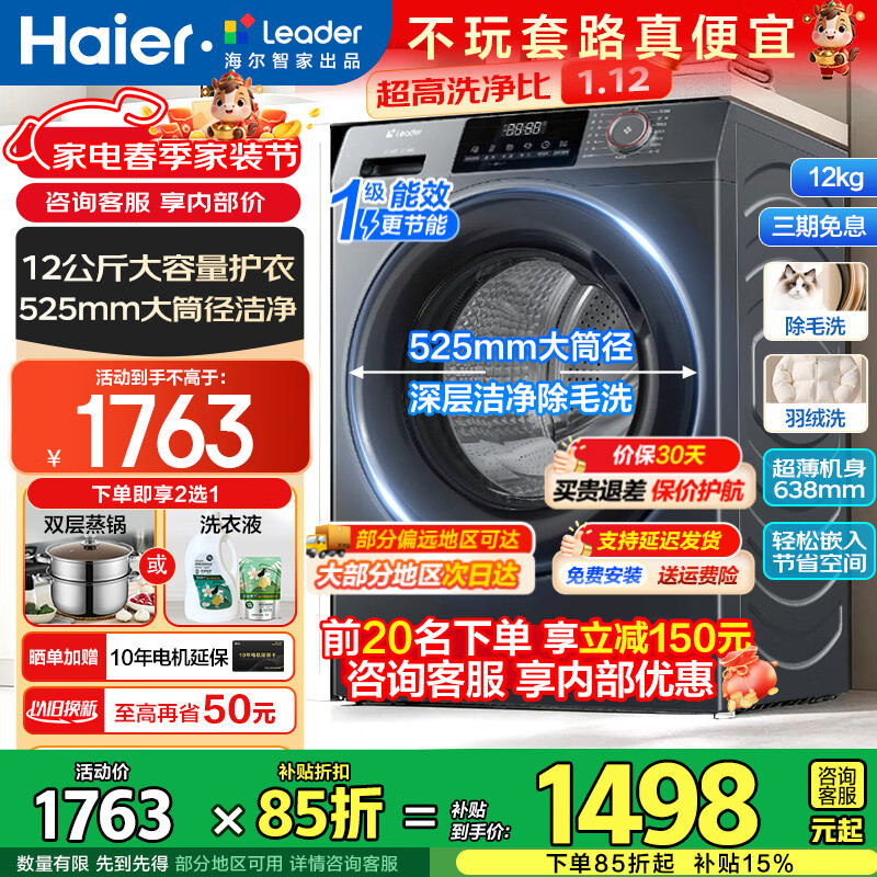 海尔(Haier)12公斤滚筒洗衣机全自动洗烘一体大容量超薄机身除菌螨一级能效省水省电667NH/50DS换新补贴洗衣机 【海尔12公斤667】大筒+除毛+除菌 滚筒单洗 统帅