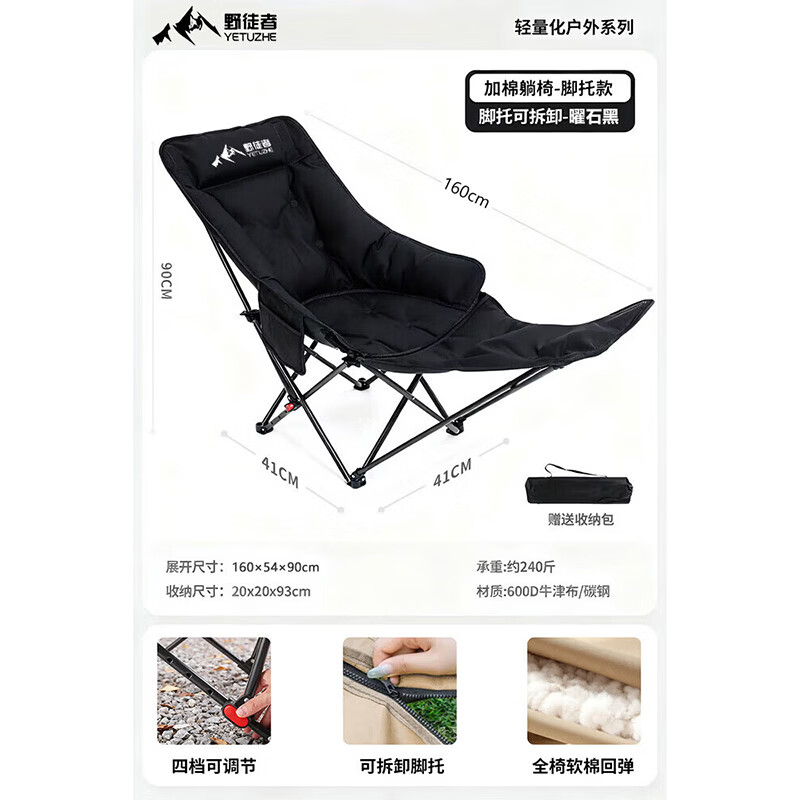 野徒者户外折叠椅躺椅月亮椅露营椅子便携式办公室坐躺睡午休钓鱼沙滩椅 【耀夜黑】四档调节+腿托【全椅舒适加棉坐躺可调节】