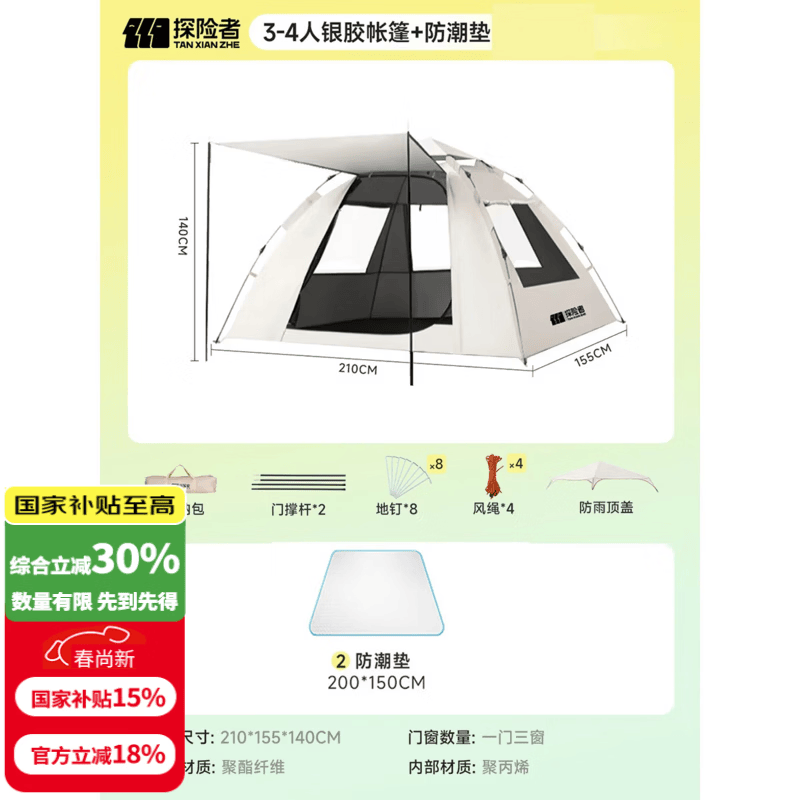 探险者帐篷户外露营防雨过夜3人-4人便携式折叠露营帐篷全自动加厚防晒 3-4人银胶帐篷+防潮垫