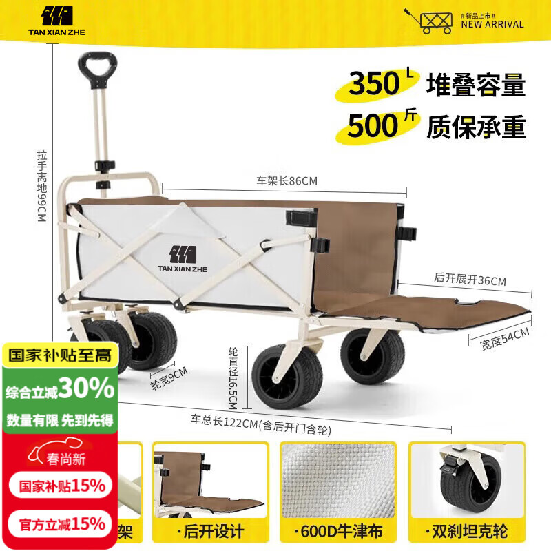 探险者露营车折叠推车户外露营儿童小推车营地车拉年货小拖车聚拢型推车 350L 云峰白-双刹坦克轮+后开模式