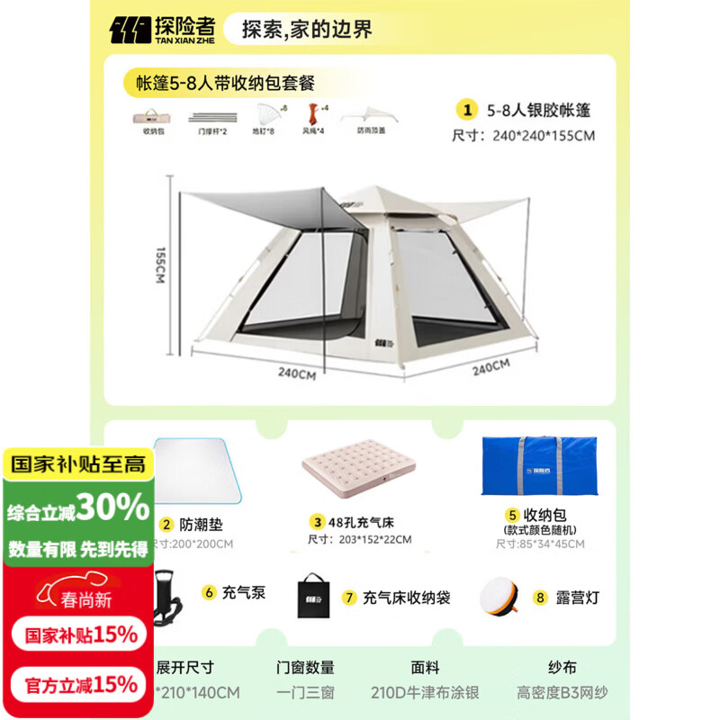 探险者(TAN XIAN ZHE)帐篷户外露营防雨过夜3人-4人速开便捷天幕二合一黑胶防晒帐篷 帐篷5-8人带收纳包套餐