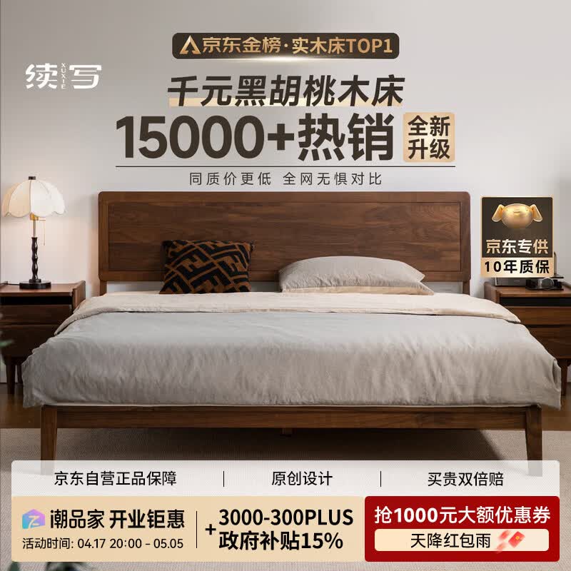 续写全实木床北美黑胡桃木单双人床现代简约卧室主卧大床1.8*2m低铺-S