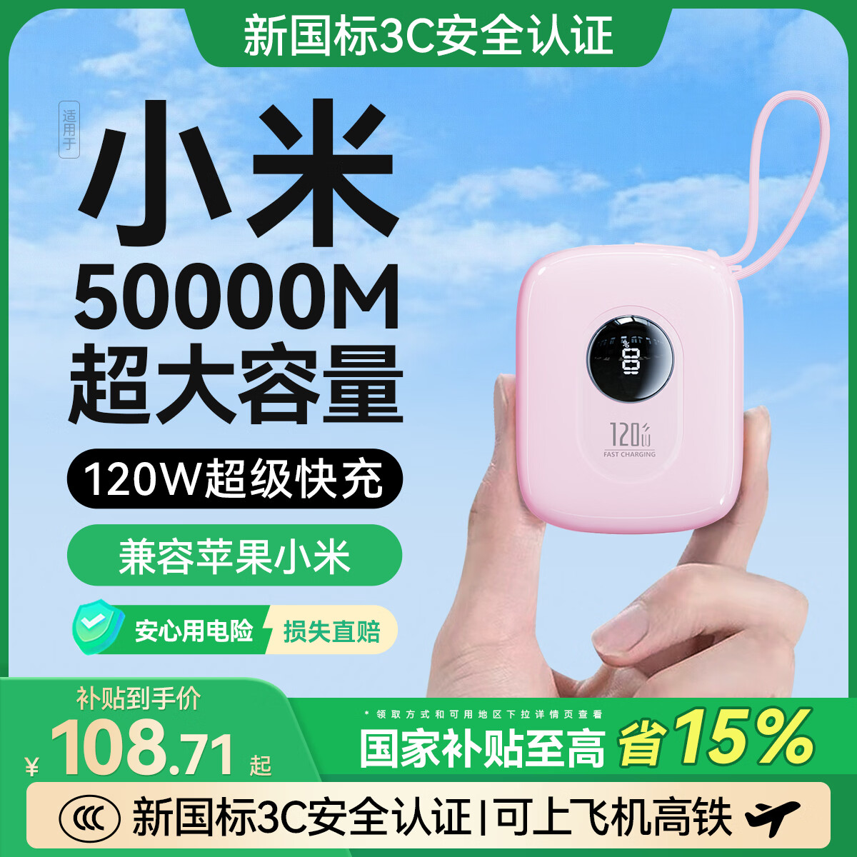 威顿【50000M顶配丨国标3C认证】适用小米充电宝20000毫安大容量可上飞机小巧便携自带线120W超级快充 50000M【彩云粉+8.0超级闪充+进口电芯】 【新3C认证|可上飞机】适用苹果/小米/安卓