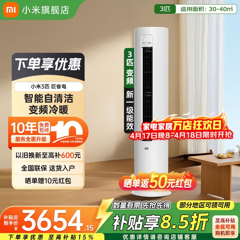 小米(MI)空调3匹 巨省电Pro 大风口柜机 新一级能效 变频冷暖 智能自清洁客厅柜机圆柱式立式空调 十年质保 巨省电柜机 3匹 一级能效
