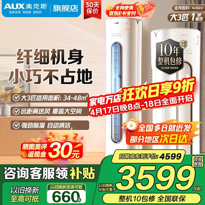 奥克斯(AUX)家电补贴15%大2匹/3匹新一级/三级能效变频冷暖节能省电家用立柜式圆柱空调柜机以旧换新 大3匹 一级能效 【省电超值性价比】32-48平