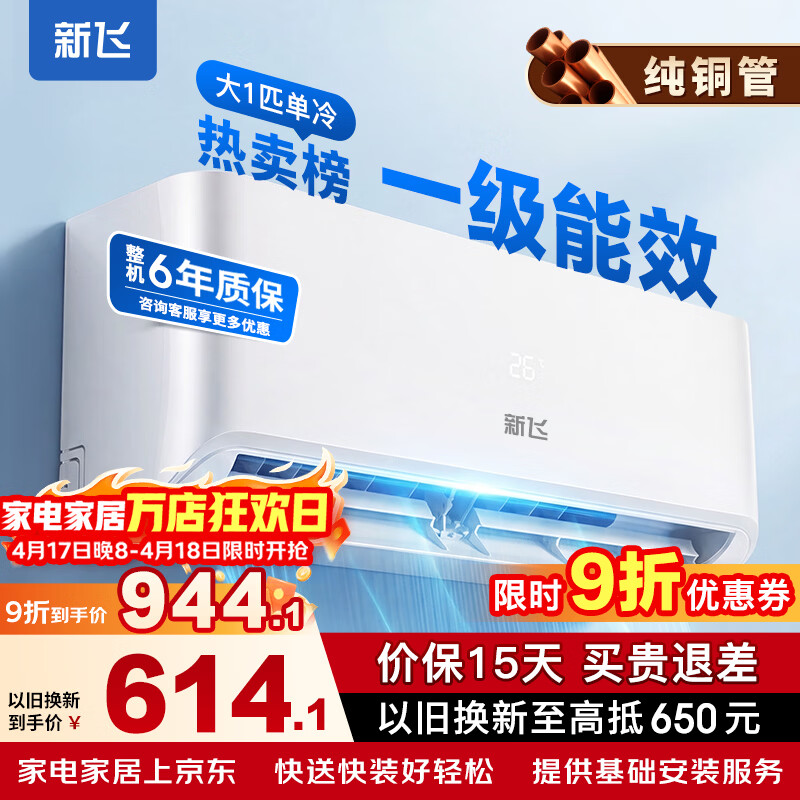 新飞(Frestec)空调 新一级能效 大1.5匹大1匹全铜管挂机 以旧换新 省电冷暖变频空调 家用壁挂式空调 单冷 大1匹 一级能效 不含安装服务