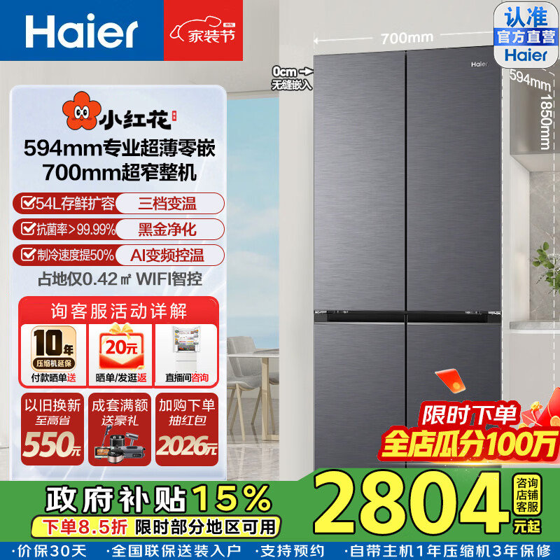 海尔小红花418升十字门冰箱超薄超窄机身零距离自由嵌入式黑金净化一级变频一级能效风冷无霜电冰箱 咨询领补贴BCD-418WGHTDB9S9U1黑