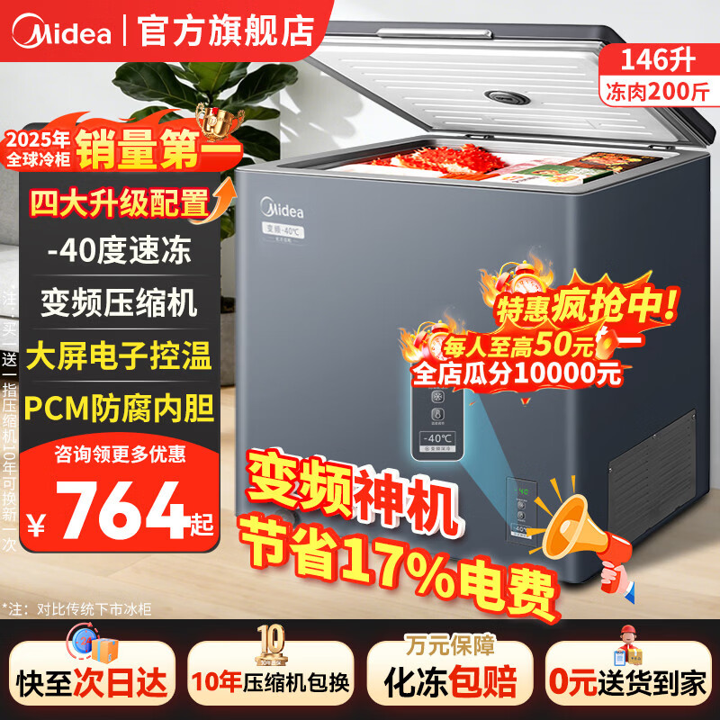 美的小钢炮冰柜家用【变频压缩机】200升零下40℃超低温海鲜速冻冷柜国家补贴一级节能无需除霜冷冻柜 146升 【王者顶配】变频丨-40度超低温