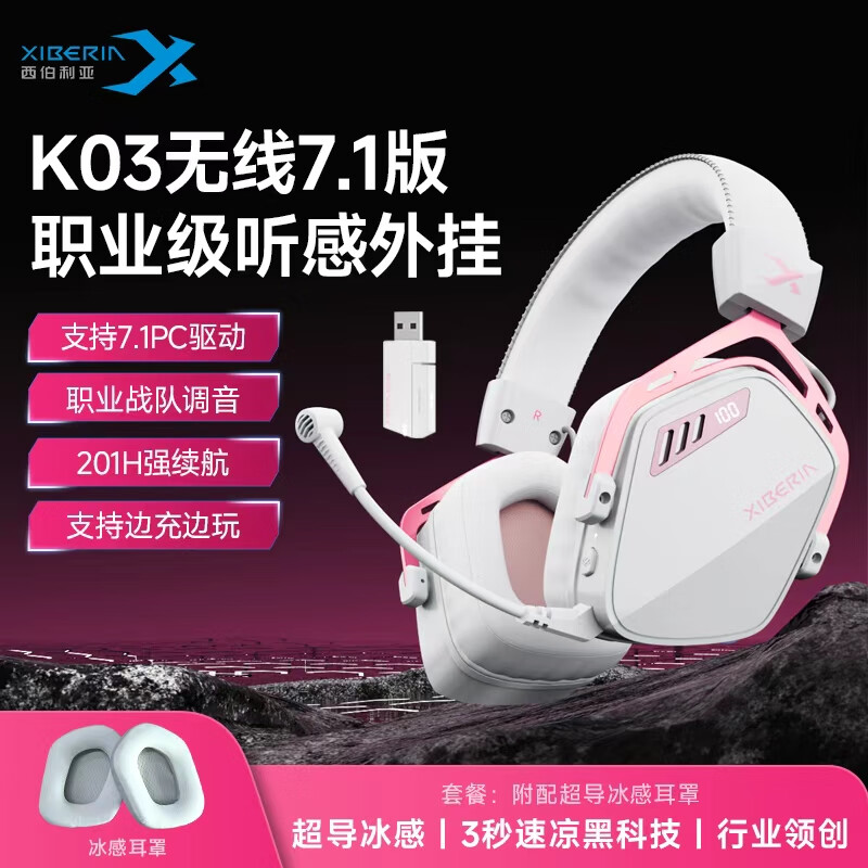 西伯利亚(XIBERIA)K03S【小叮当同款】2.4G无线游戏耳机头戴式 蓝牙有线四模电脑电竞吃鸡耳麦电量可视化fps听声辩位 极光粉7.1版+冰感耳罩|边充边玩|支持驱动