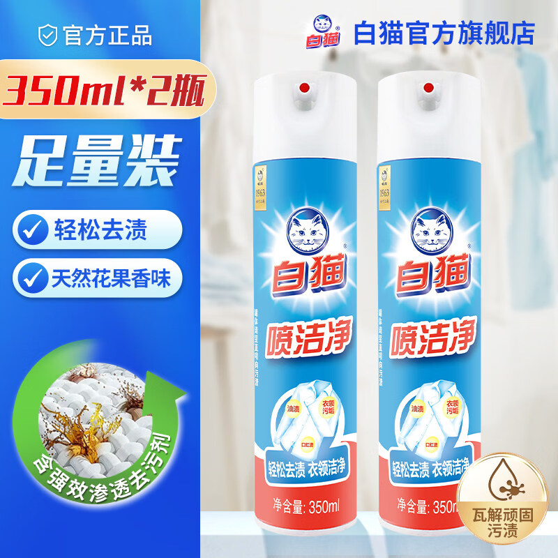 白猫喷洁净600ml 衣领净 羽绒服清洗剂 校服净 去油渍 渍无踪 350ml*2瓶【喷洁净分享装】