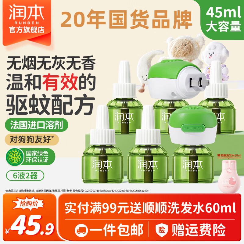 润本蚊香液电蚊香液驱蚊液定时加热器驱蚊防蚊蚊香无香型驱蚊水 【普通款无定时2居室】无味6液+2器