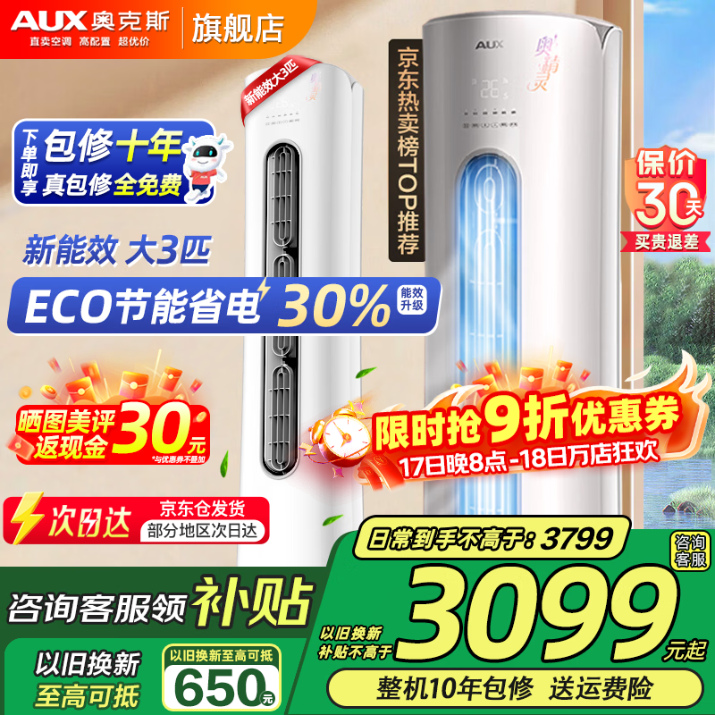 奥克斯(AUX)大3匹新一级三级能效柜机空调立式2P 家电补贴20% 变频冷暖省电 自清洁高温除菌立柜式空调 大3匹 三级能效 【爆款超值性价比】32-48平 【强劲冷暖 除菌自清洁】