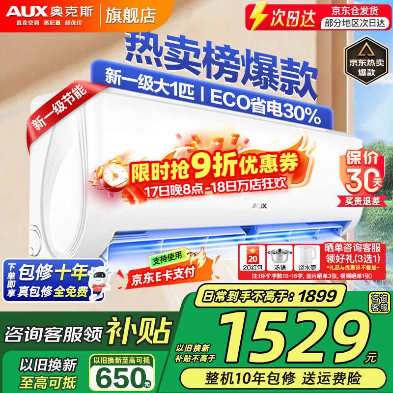 奥克斯(AUX)家电补贴20%空调 大1.5匹/1匹新一级/三级变频冷暖 节能静音除菌自清洁空调挂机 以旧换新 大1匹 一级能效 【新升级变频冷暖】10-17平
