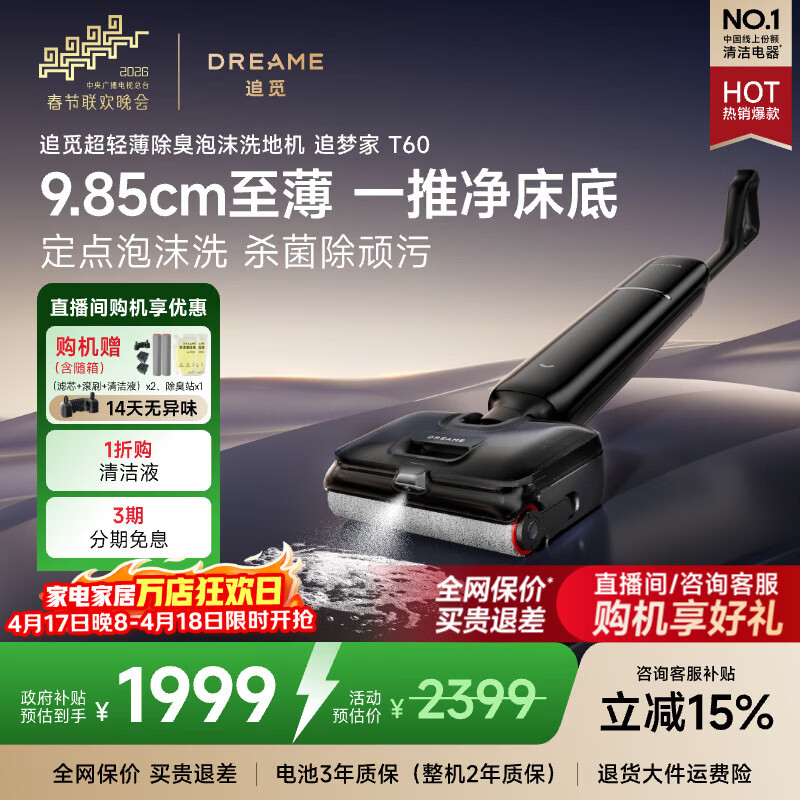追觅【春晚同款】洗地机追梦家T60Ultra双机械臂9.85cm超薄洗拖吸一体自动清洗拖地机扫地机器人吸尘器 T60【9.85cm超薄 泡沫洗2.0】