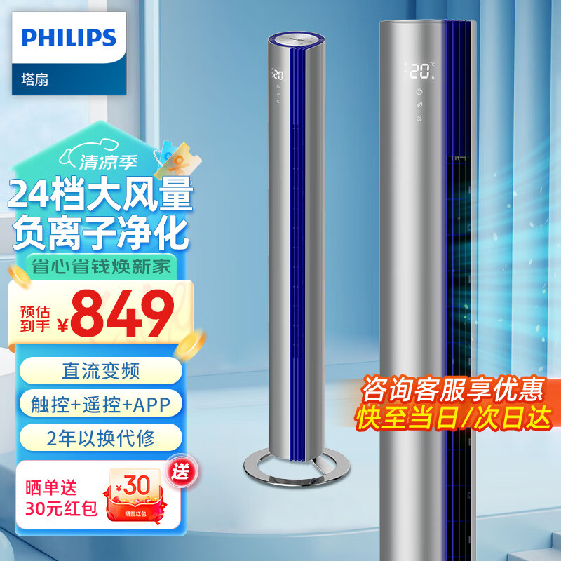 飞利浦(PHILIPS)电风扇塔扇家用落地扇直流变频无叶风扇空气循环扇智能遥控定时客厅大风量立式遥头 【旗舰】ACR4144TF【24档风+负离子净化】