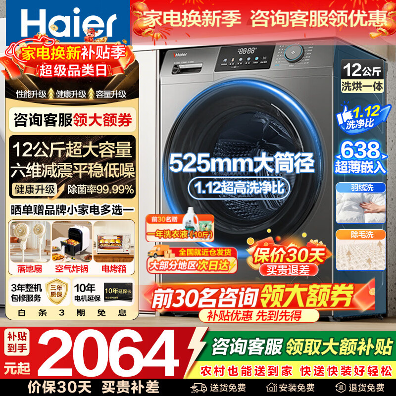 海尔(Haier)洗衣机12公斤【26年新品】滚筒全自动洗衣机大容量洗烘一体除菌省水省电525mm大筒国家补贴统帅 滚筒洗烘 12kg 海尔50DS+蒸汽除菌+毛絮自清洁