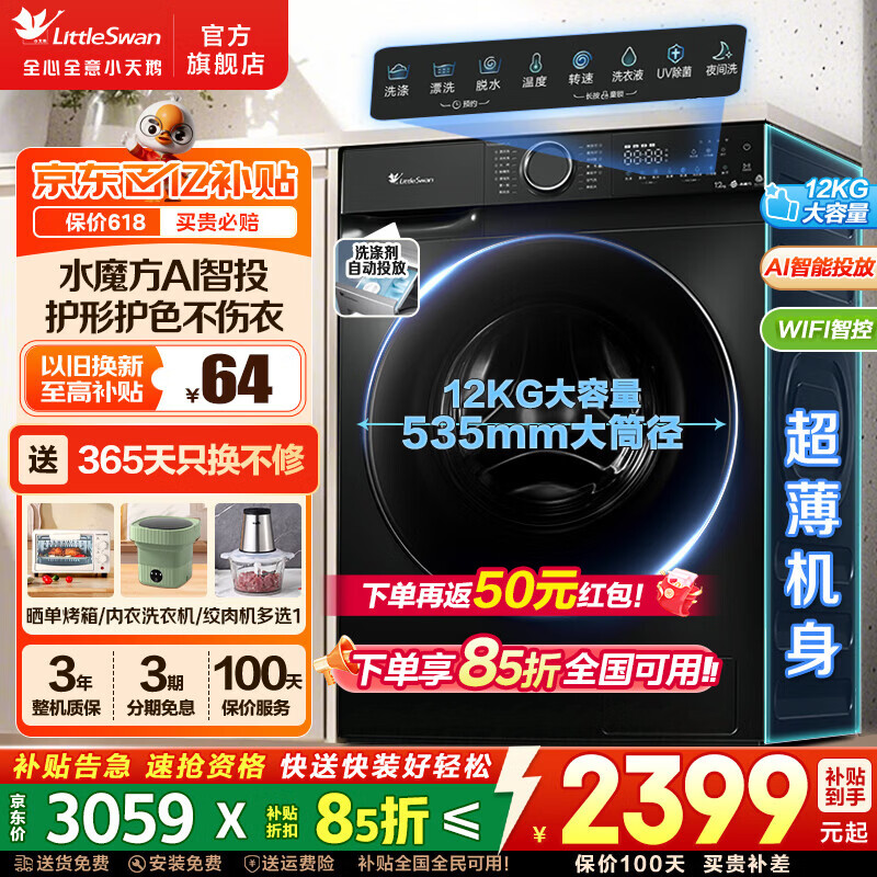 小天鹅(LittleSwan)滚筒洗衣机 水魔方家用大容量全自动洗脱/洗烘一体烘干冷水洗变频除菌超薄纯平全嵌 智投 家电补贴 【12公斤618P洗脱】AI智投+水魔方 滚筒单洗