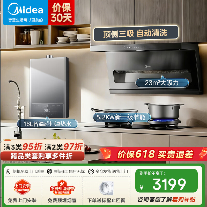 美的(Midea)顶侧三吸油烟机 23立方爆炒大吸力 7字型烟机自动清洗挥手智控家用抽油烟机炉灶燃气灶套装DP55 【烟灶热】配5.2KW节能灶A3+16L热水器(天然气)