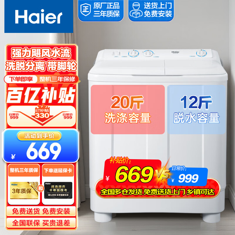 海尔(Haier)半自动洗衣机双桶双缸10公斤家用小型大容量双电机强劲动力省水电洗脱分离波轮以旧换新老式洗衣机 10公斤赠10年电机延保 双缸 强劲飓风水流+移动脚轮