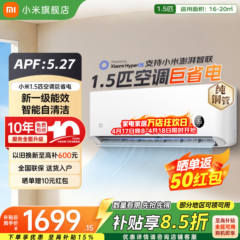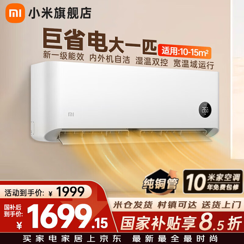 小米(MI)米家新款1.5匹巨省电 双排款 健康风 变频冷暖智能互联自清洁一级能效壁挂式卧室客厅家用空调挂机 大1匹 一级能效 巨省电 【快速制冷/热 高性价比】