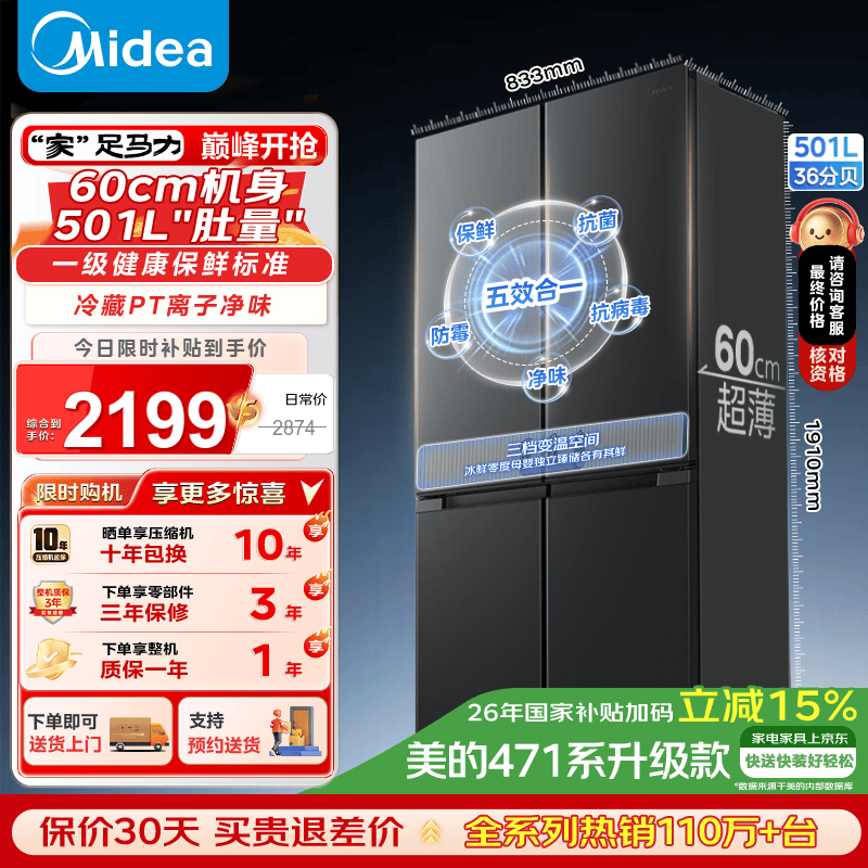 美的(Midea)真香系列500L十字门冰箱60厘米超薄大容量一级能效家用电冰箱以旧换新国家补贴 大容量净味保鲜款