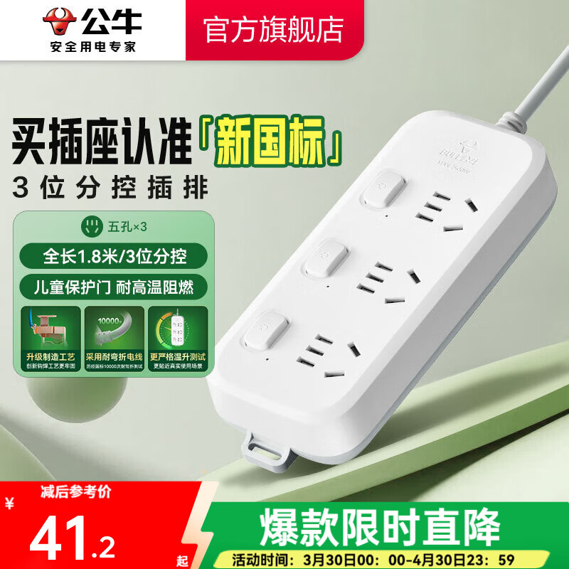 公牛(BULL) 插座/B5系列 带儿童保护门/新国标插座/排插 【3位】分控1.8米(新国标)B5033