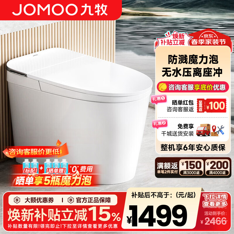 九牧(JOMOO)轻智能马桶一体机全自动冲水恒温座圈虹吸式一级水效坐便器 【零压魔力泡易清洁】SQ6656 400mm (390以上选择)