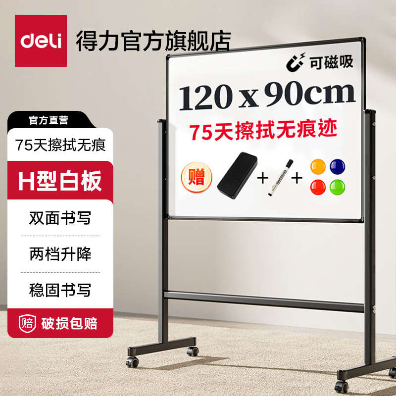 得力(deli)H型支架式白板 可上下升降可移动可磁性吸附办公会议白板 家用儿童教学画板写字板 【高品质款】120*90cm 双面书写 2档升降