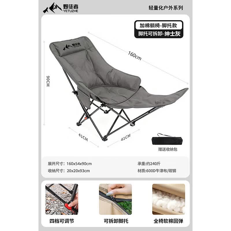 野徒者户外折叠椅躺椅月亮椅露营椅子便携式办公室坐躺睡午休钓鱼沙滩椅 【绅士灰】四档调节+腿托【全椅舒适加棉坐躺可调节】