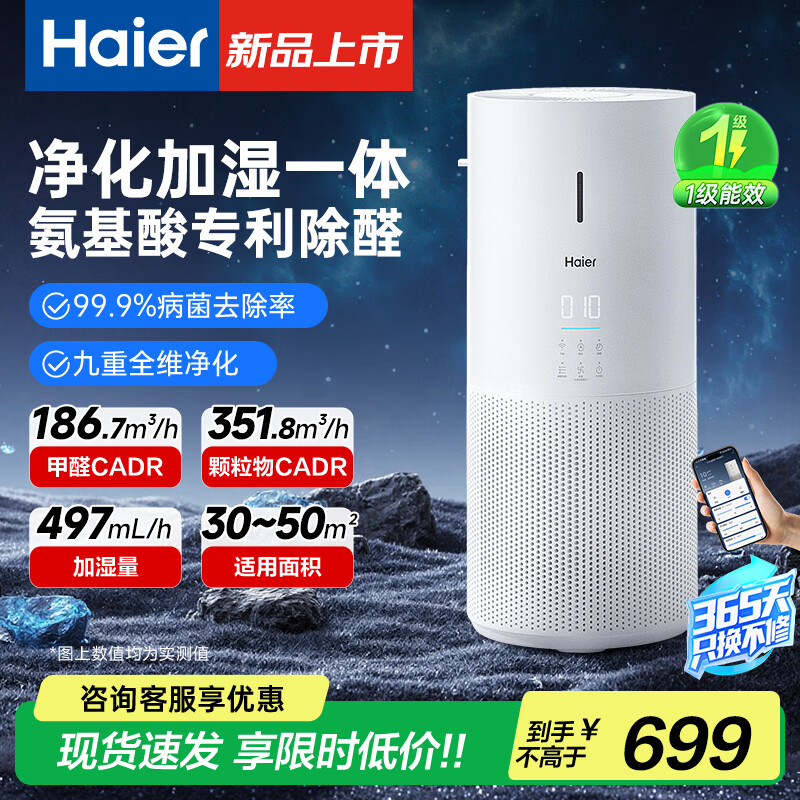 海尔【新品上市】空气净化器家庭用卧室内除甲醛消毒除菌除烟味除宠物异味净化无雾加湿一体机KJ320 净化加湿一体升级版