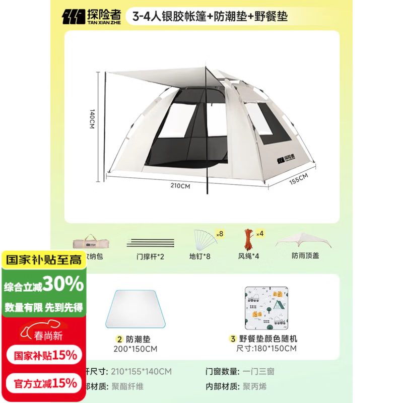 探险者帐篷户外露营防雨过夜3人-4人便携式折叠露营帐篷全自动加厚防晒 3-4人银胶帐篷+防潮垫+野餐垫