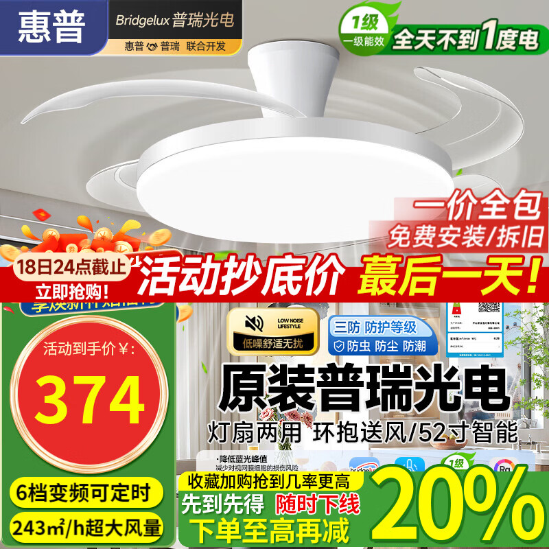 惠普风扇灯普瑞护眼LED隐形扇叶餐厅卧室遥控调光一体无叶吊扇灯中山 1级能效/吸顶52寸普瑞光/喵喵精灵