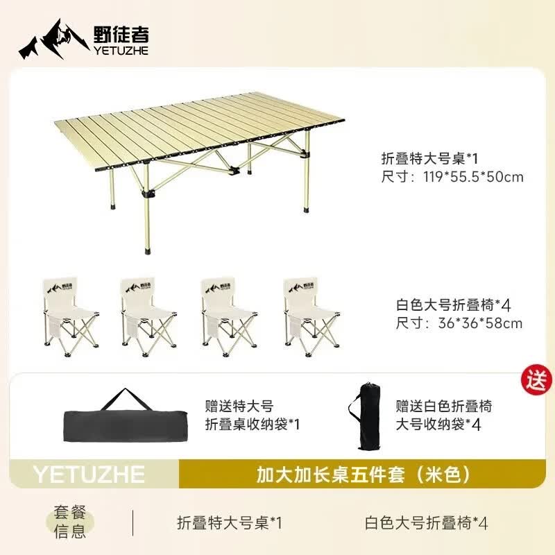 野徒者露营桌椅全套户外桌椅折叠椅野餐一桌四椅户外露营装备野炊蛋卷桌 120桌五件套【120桌+四椅】米色 新款升级