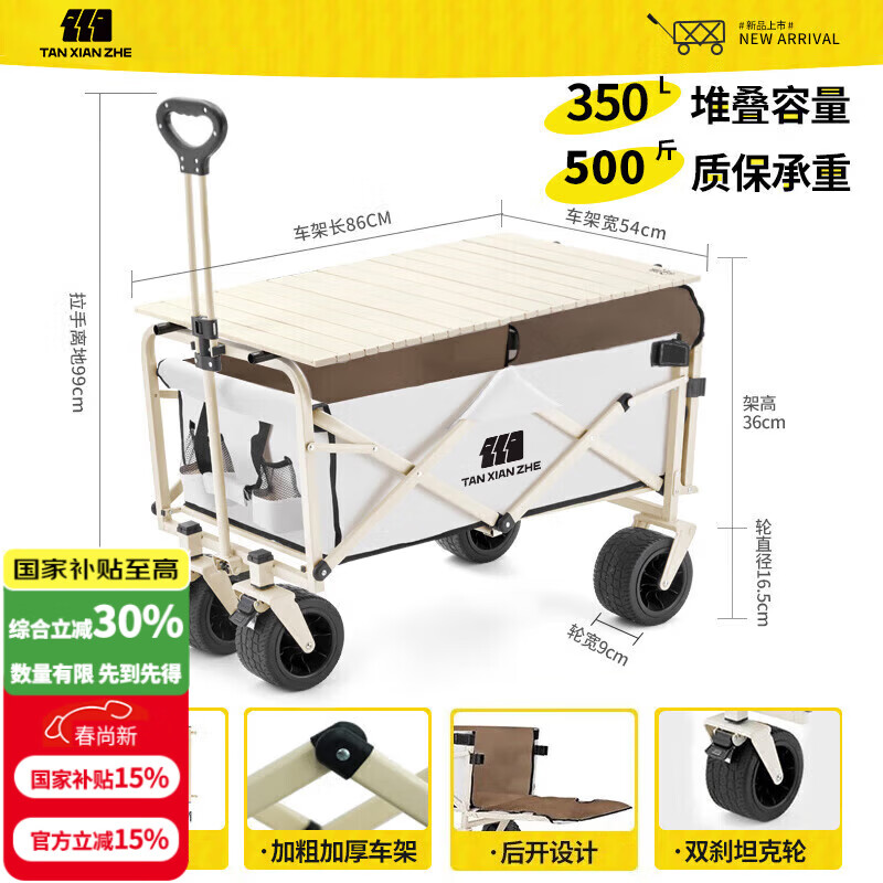 探险者露营车折叠推车户外露营儿童小推车营地车拉年货小拖车聚拢型推车 350L 云峰白-双刹坦克轮+碳钢桌板