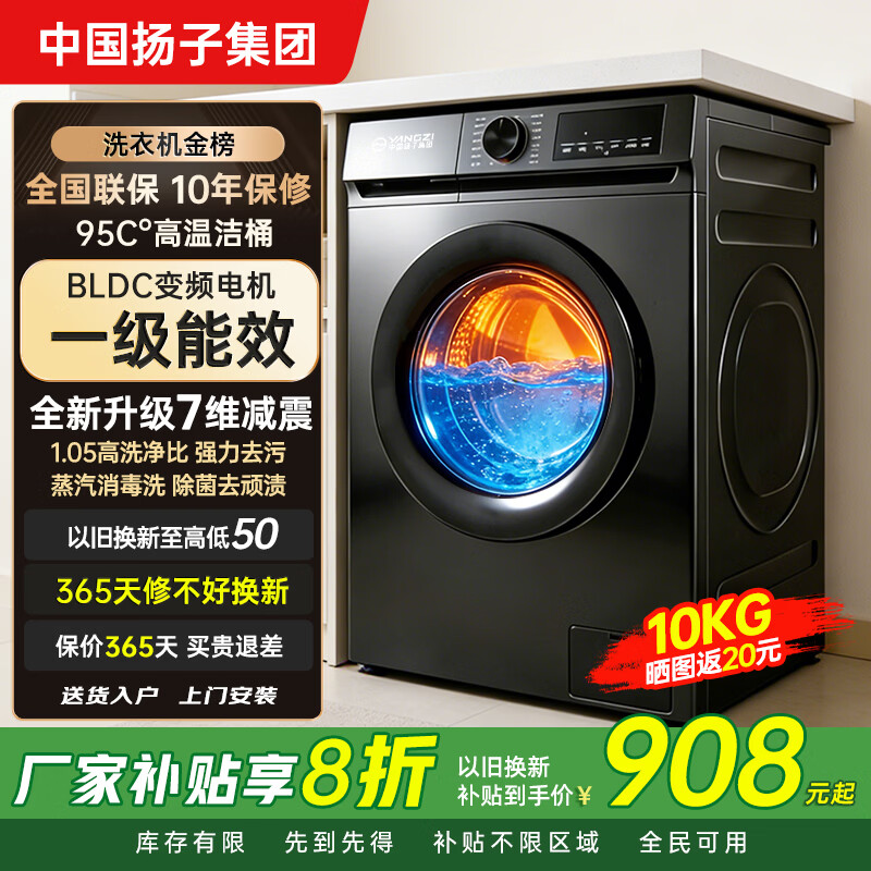 扬子集团【补贴20%】10公斤洗脱一体滚筒洗衣机超薄全自动节能家用大容量洗衣机 10kg高温+蓝光 上门安装 一级变频 10年保修 滚筒