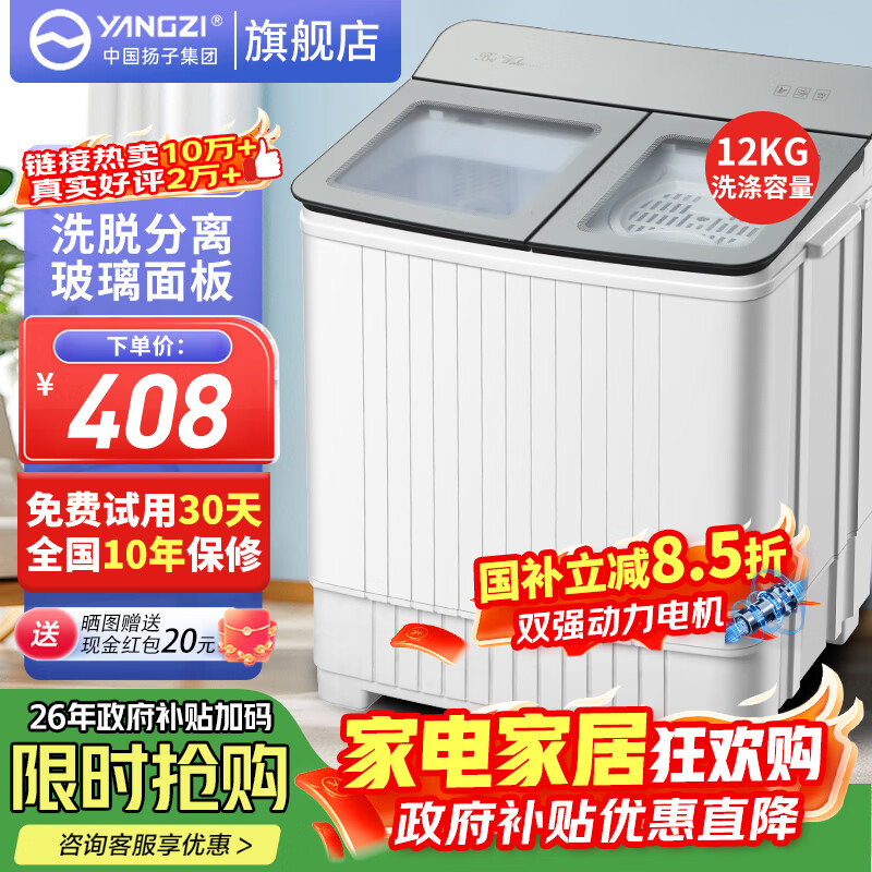 扬子中国扬子集团洗衣机 半自动大容量30KG家用双桶双缸洗衣机脱水双筒 19玻璃盖【洗12KG+脱7KG】蓝光 双缸