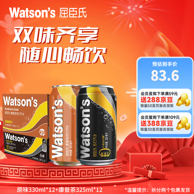 屈臣氏(Watsons)苏打汽水 气泡水 特调饮料 330ml*24罐 整箱装 聚会饮品 原味330ml*12+康普茶325ml*12