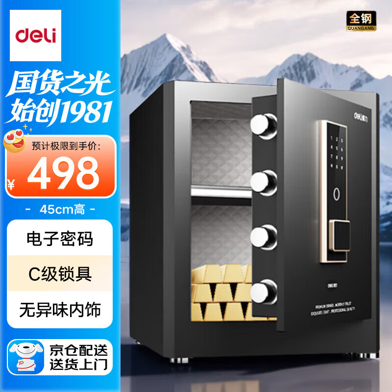 得力(deli)保险柜 家用办公电子密码保险箱小型全钢防盗保密箱可入墙入柜保管柜 45cm曜岩黑 弘雅系列