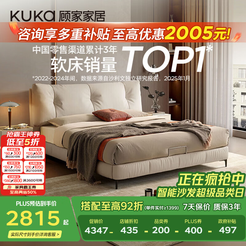 顾家家居(KUKA)【智惠系列】奶油风高端大气皮床双人床DS8395B【雪羽白】高脚1.8