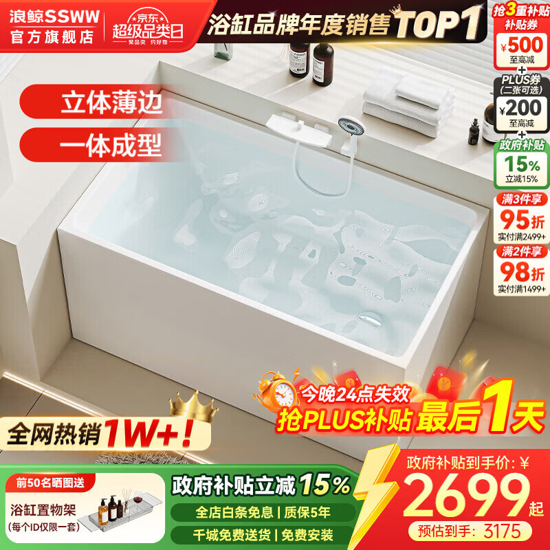 浪鲸(SSWW)卫浴独立式小户型浴缸家用成人亚克力深泡方形薄边泡澡浴池缸1051 1.4米独立式空缸