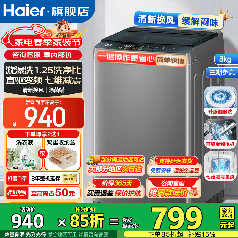 海尔(Haier)海尔智家出品leader波轮全自动洗衣机6/8/10公斤波轮洗衣机家用大神童容量出租神器补贴15%洗衣机 【高配版8公斤20D0】直驱+一级能效+漩瀑洗 波轮