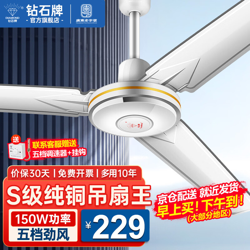 钻石牌(DIAMOND)吊扇电风扇铜芯电机铜线家用吊顶风扇56吋工业工厂车间客厅吊风扇大风力宿舍电扇 S级56寸升级吊扇王(150W纯铜电机)