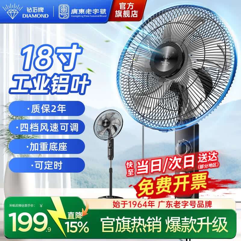 钻石牌(DIAMOND)电风扇落地扇家用风扇立式大风力客厅宿舍五叶扇轻音节能劲风远距电扇可定时SN 18寸强风四档【铝叶劲风】