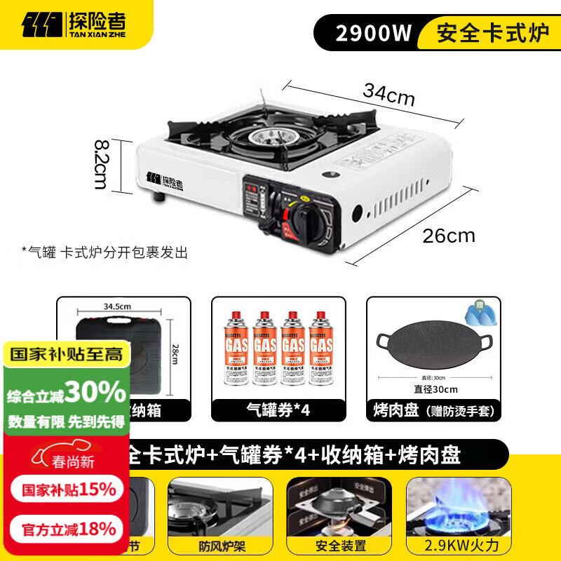 探险者(TAN XIAN ZHE)户外卡式炉露营炉具便携式野外煮火锅炉子卡磁炉全套带锅野餐套装 卡式炉+箱+气券(赠品)*4+烤盘