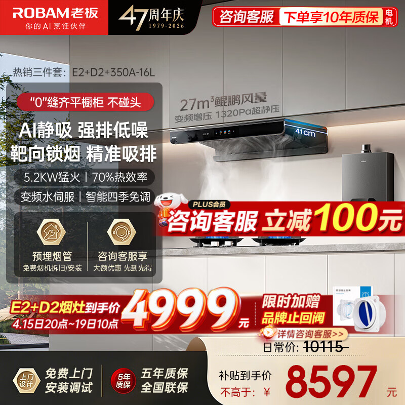 老板(Robam)【升级款E2+D2特价】抽吸油烟机燃气灶套装 家用欧式顶吸27风量吸力1320Pa静压 烟灶套装 一级能效 【速抢 6999套装】烟灶+16L水伺服热水器350A