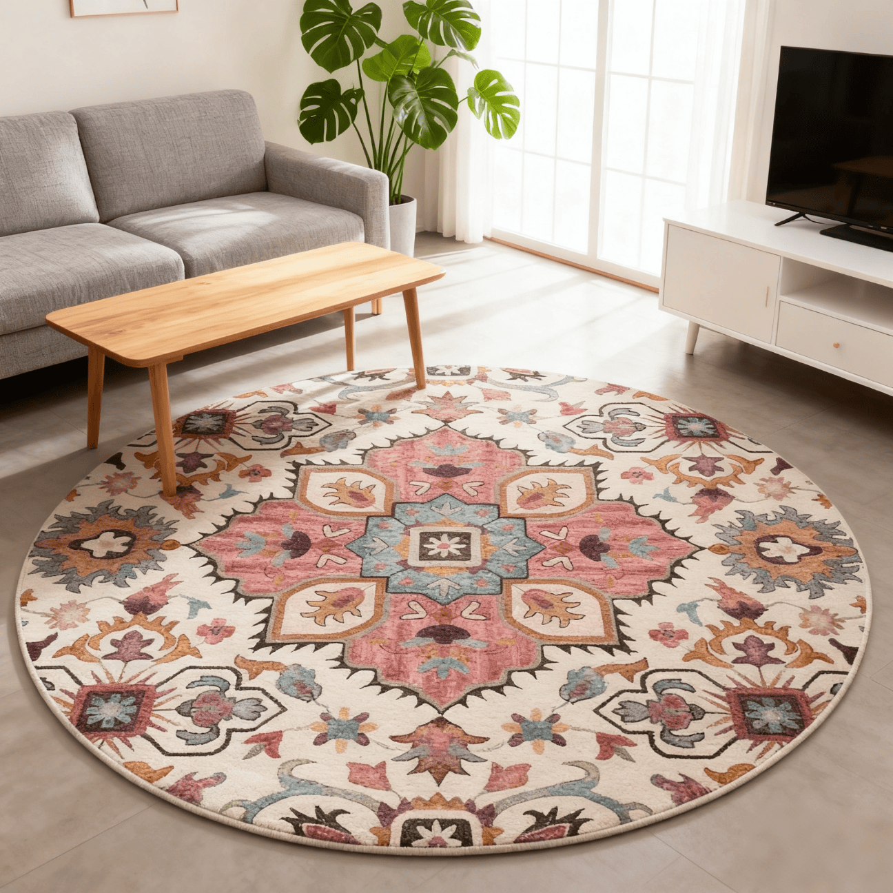 欧纶斯(Oulens)圆形地毯轻奢风高级感客厅地垫茶几毯卧室门口沙发床边毯可水洗 北欧Red圆形 140cm*140cm 【绒面亲肤】