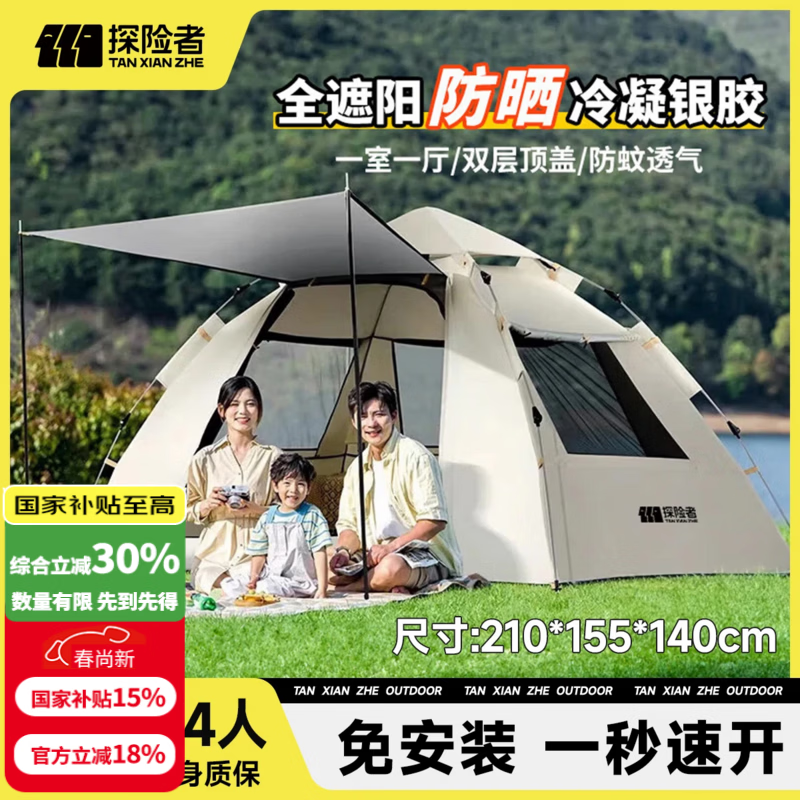 探险者帐篷户外露营防雨过夜3人-4人便携式折叠露营帐篷全自动加厚防晒 3-4人银胶款【一门三窗】云雾白