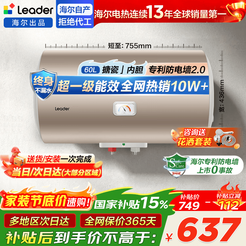 海尔(Haier)【咨询领补贴】热水器电热水器储水式免清洗以旧换新上门安装一级能效变频节能速热家用统帅 60L 2200W 节能耐用/一级能效/水电分离