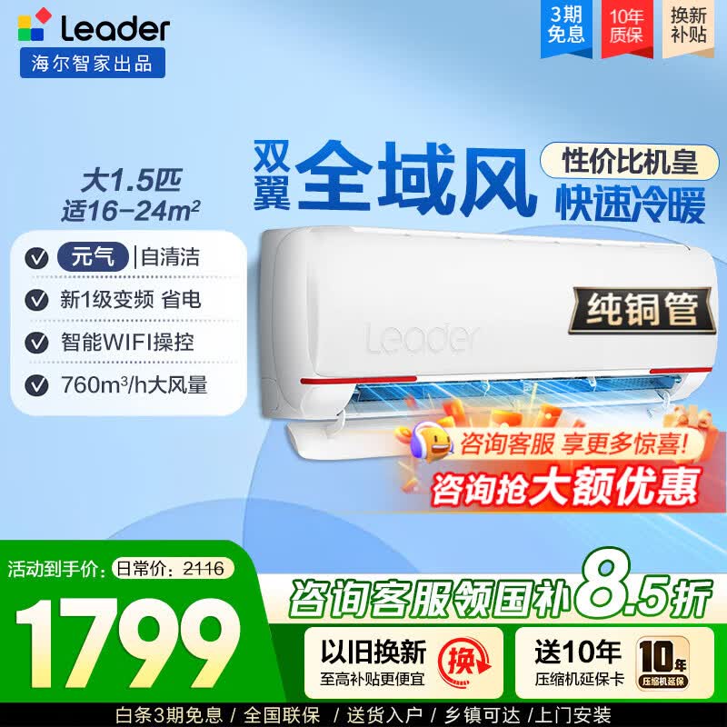海尔空调出品统帅空调1.5匹新一级能效变频空调挂机 超省电空调 变频冷暖自清洁壁挂式 元气 1.5匹 一级能效 变频冷暖 节能省电